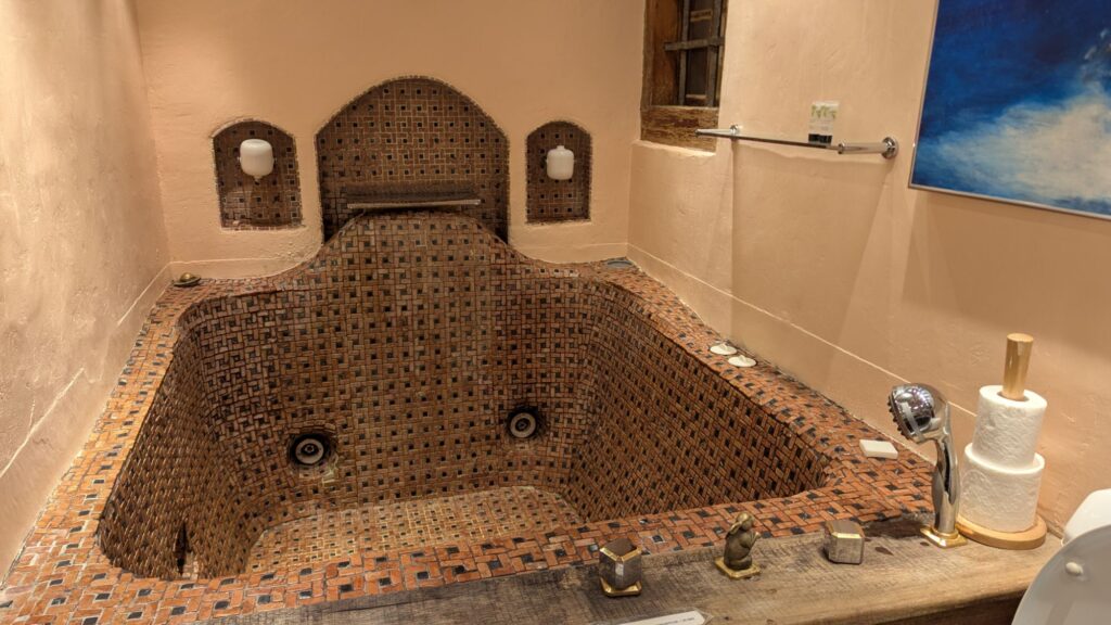 Den venlige mand i receptionen viste os hen til vores hytte for natten, samt hvor vi kunne gå i sauna, noget hamam badehalløj, og vore egne hot tub (indtil kl. 18 kunne alle gæster benytte den, men efter 18 var den heeelt privat).